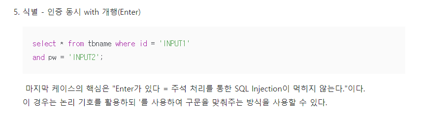 위의 포스팅에서 로그인 로직을 케이스 별로 5가지를 살펴보았는데, 그중에 마지막 케이스가 바로 개행(Enter)을 넣어 주석을 방어하는 방식이었다.