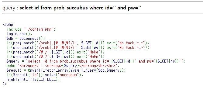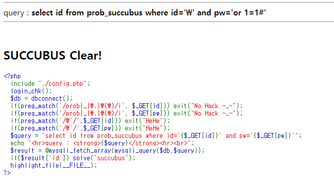 select id from prob_succubus where id='\' and pw=' or 1=1#'