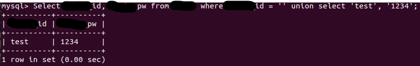 이때, id와 pw를 선택하는 구문과 함께 union을 사용하여 select 'test', '1234';를 실행하면, id와 pw의 콜럼으로 'test'와 '1234'의 데이터가 들어가게 된다. (Column과 Table 이름이 달라서 그 부분만 가렸다.)