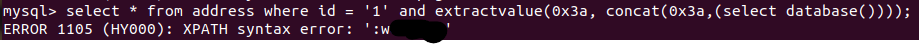 마찬가지로 address 테이블에서 에러를 포함한 extractvalue 함수를 사용하니 DB 이름이 포함된 에러 메시지가 출력된 것을 확인할 수 있다.
